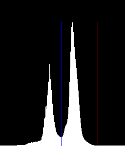 img = cv2.cvtColor(img, cv2.COLOR_BGR2GRAY) hist = cv2.calcHist([img], [0], None, [256], [0, 256]) # search max value on histogram M = hist[0] i = 0 for j in range(1, 256): cur = hist[j] if cur > M: M = cur i = j if i > 253: prev = hist[i] else: prev = hist[i] + hist[i + 1] + hist[i + 2] # search first grow up on the right for j in range(i + 15, 254): cur = hist[j] + hist[j + 1] + hist[j + 2] if cur >= prev: break prev = cur right = j if i < 2: prev = hist[i] else: prev = hist[i - 2] + hist[i - 1] + hist[i] # search first grow up on the left for j in range(i - 15, 2, -1): cur = hist[j - 2] + hist[j - 1] + hist[j] if cur >= prev: break prev = cur left = j