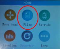 Insérez la carte microSD dans l’emplacement prévu sur l’imprimante 3D (c’est-à-dire dans la fente en haut sur le coté gauche du bloc de l’alimentation. A partir du menu appuyez sur « files » et choisissez votre fichier .gcode. appuyez ensuite sur « start ».